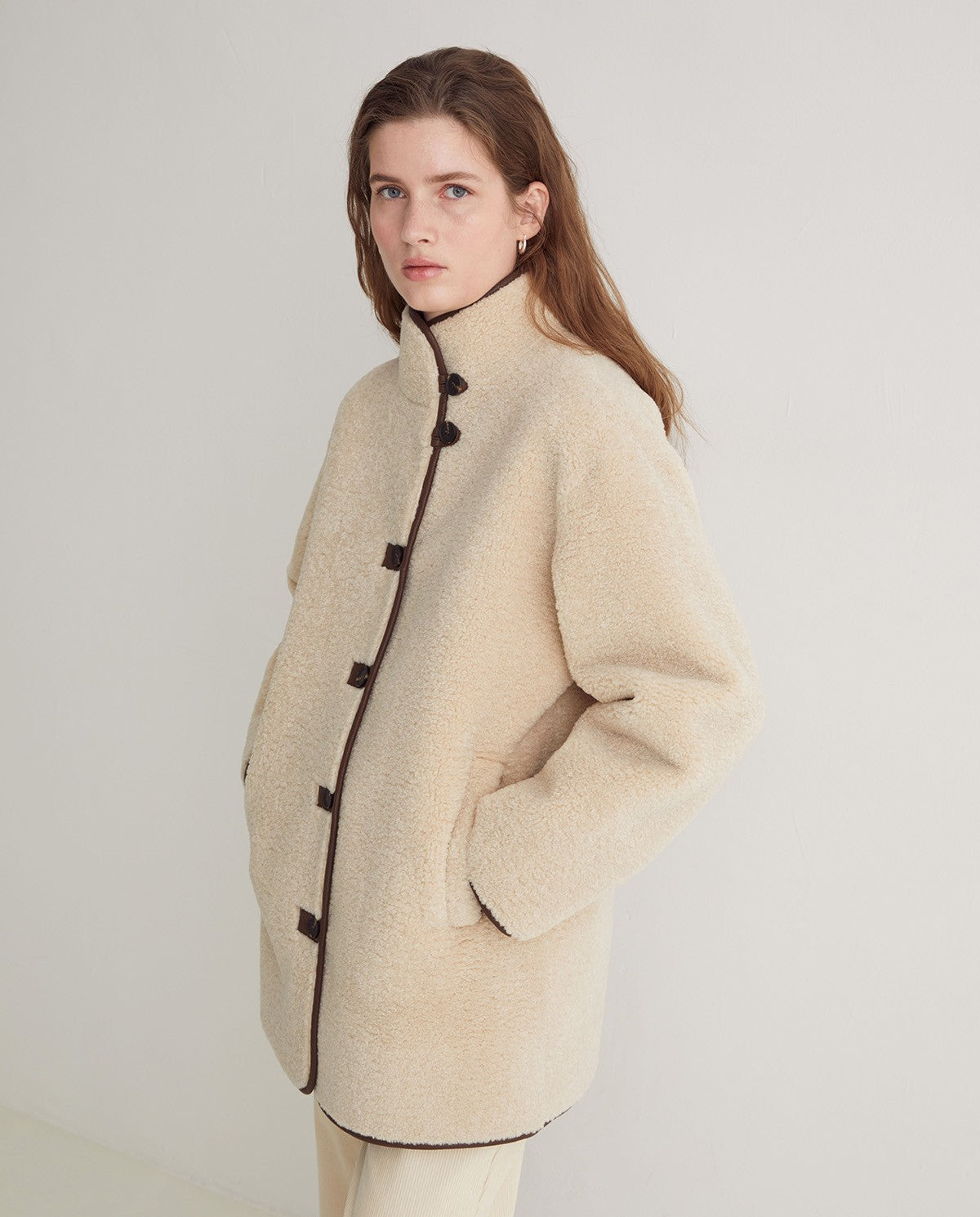 Double-faced faux-shearling coat. Regular fit. High neck. Long sleeves. Long sleeves. Front buttons. 3 side pockets.