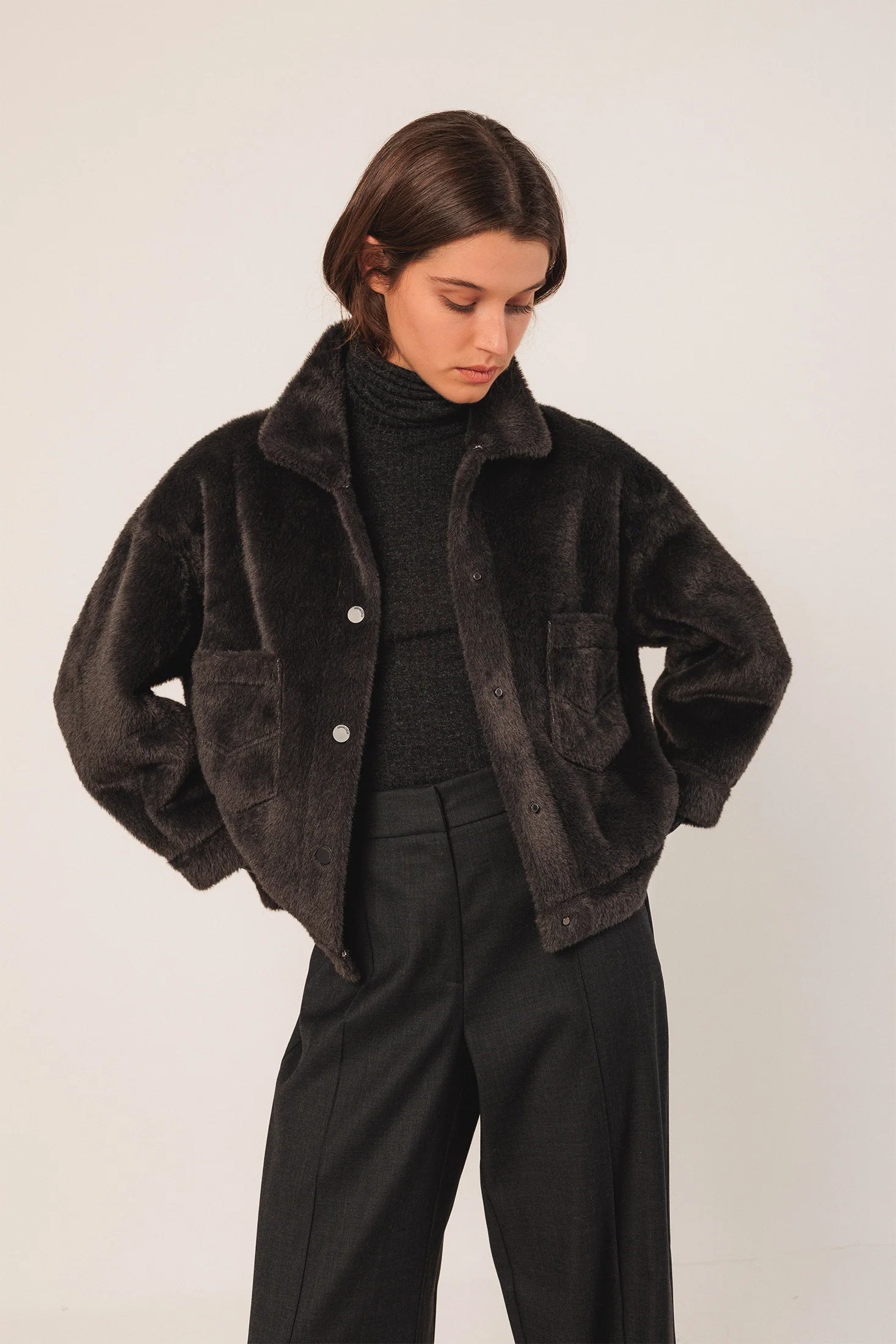 Super soft jacket with fur fabric, dropped shoulders and slightly puffed sleeves. It has a snap closure in the front and a half- placket closure in the back, so you can wear it loose and give a different touch to your look.