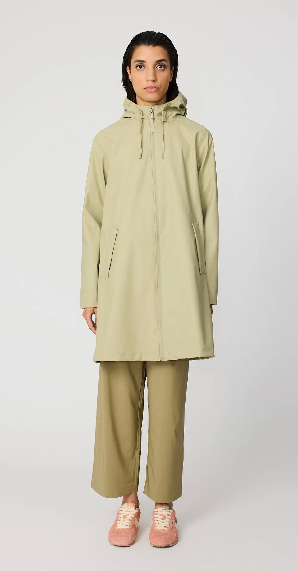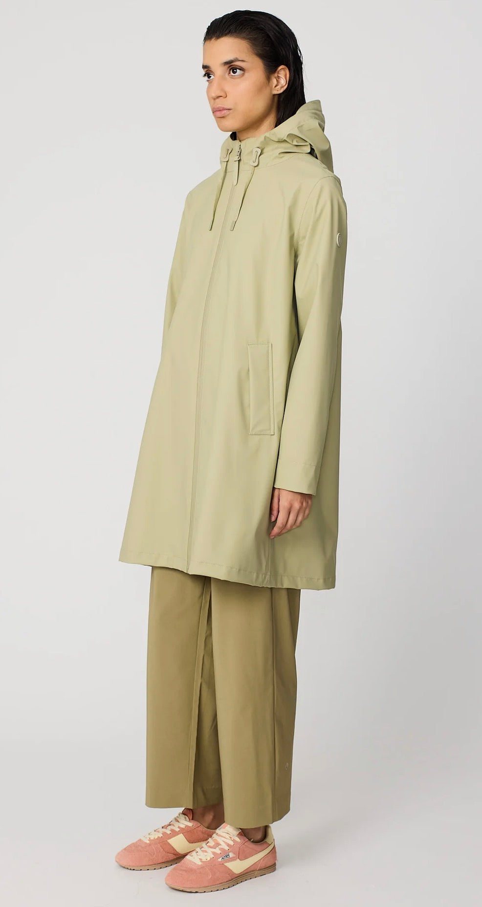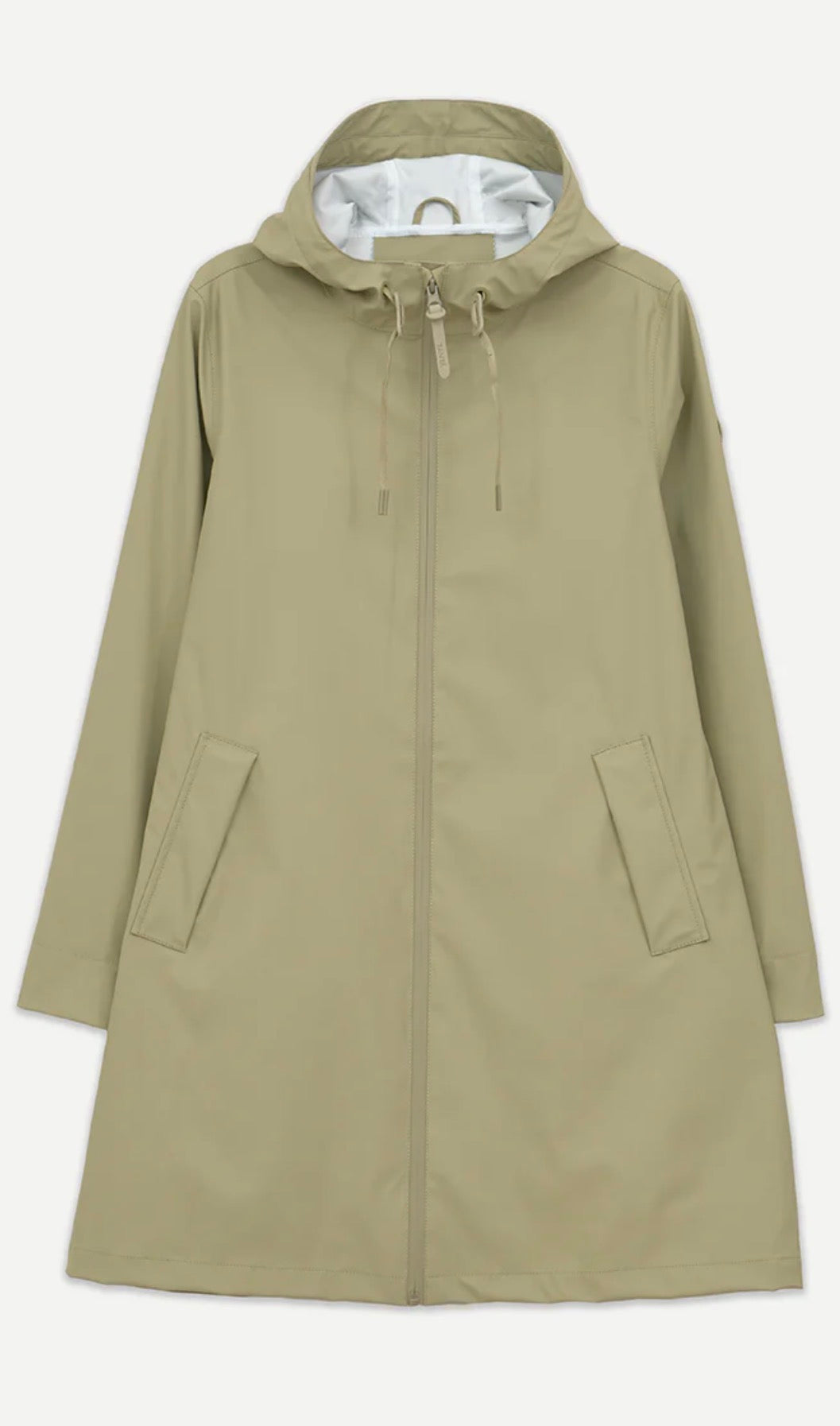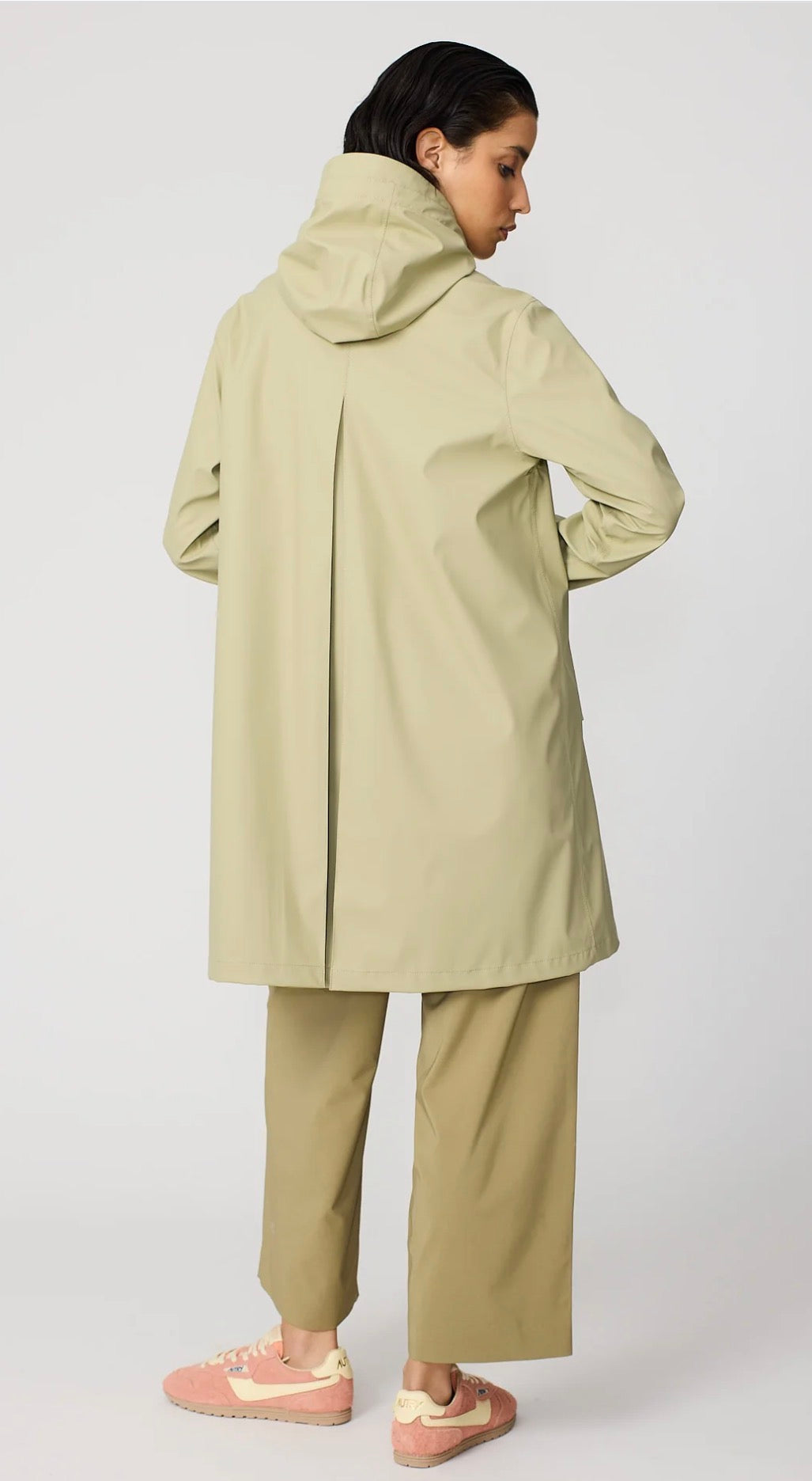 Women's waterproof raincoat designed for daily use in transition seasons, the Nuovola raincoat is made with our iconic polyurethane fabric and has a fold on the back that provides a unique A-shaped volume. The mid-thigh length is complemented by a sealed zipper on the front and windbreak cuffs on the inside of the sleeve for additional protection against the most unpredictable weather. Fits the actual size.