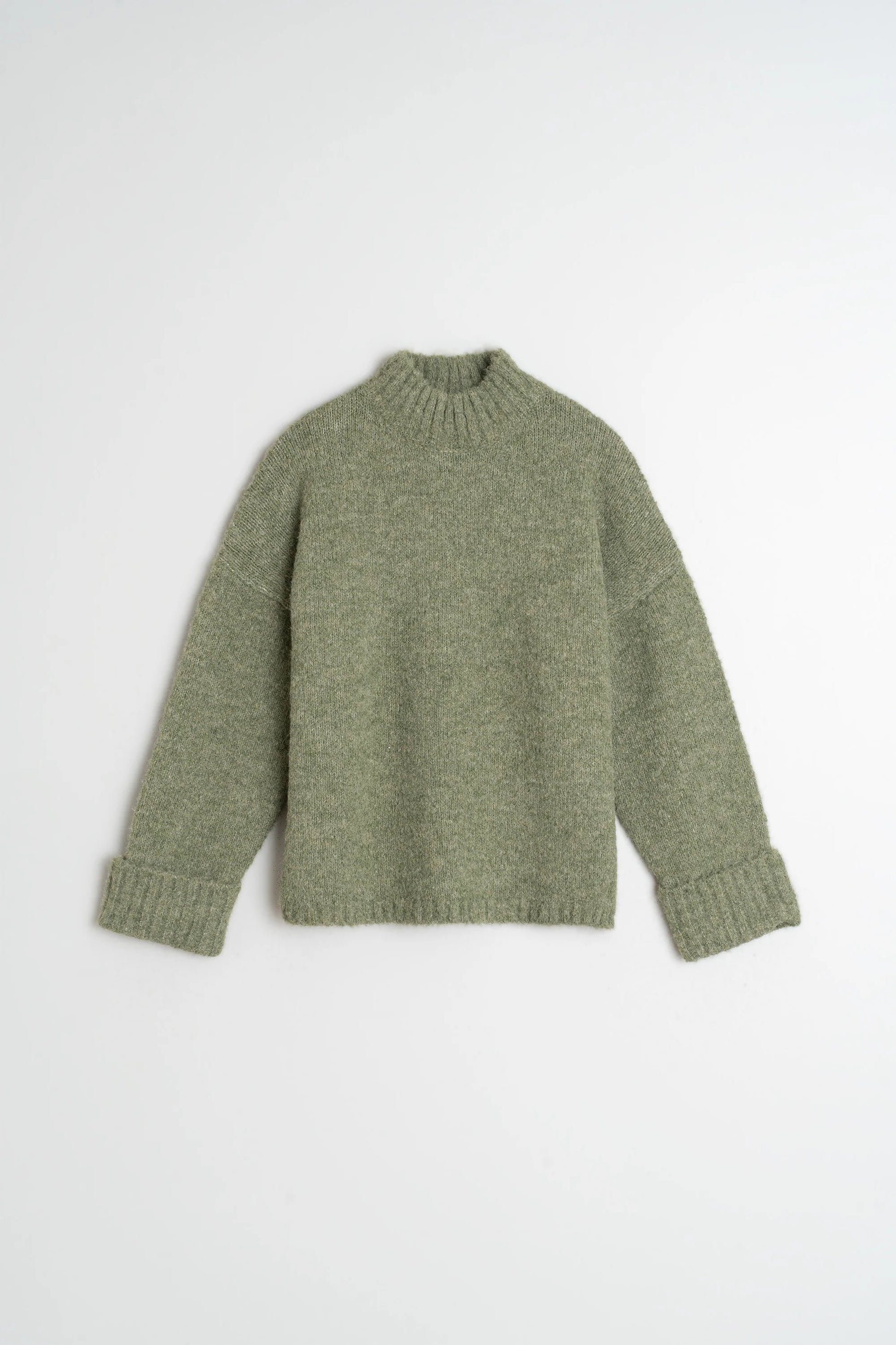 •• Dropped shoulder and long sleeves • Ribbed collar, cuffs and hem • Knitted fabric with wool and recycled fibers • Relaxed fit: Designed to feel slightly loose • Measurements on size S flat: Length from shoulder: 57cm. Chest width: 55cm. Bottom width: 55cm. • Sizing: +1 cm in length per size and +2 cm in contours.
